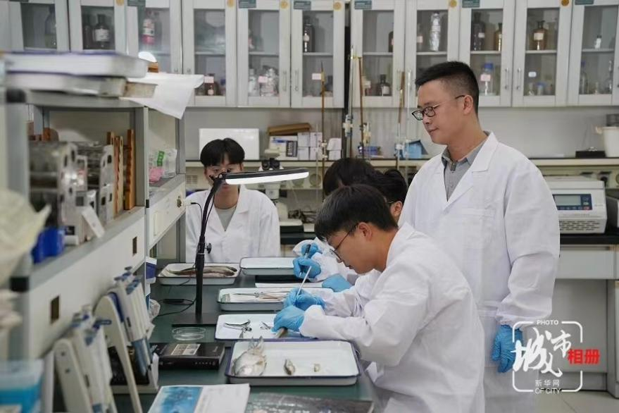 在实验室指导研究生进行鱼类的分类鉴定,右一为何滔(图源新华网,黄俊辉摄)